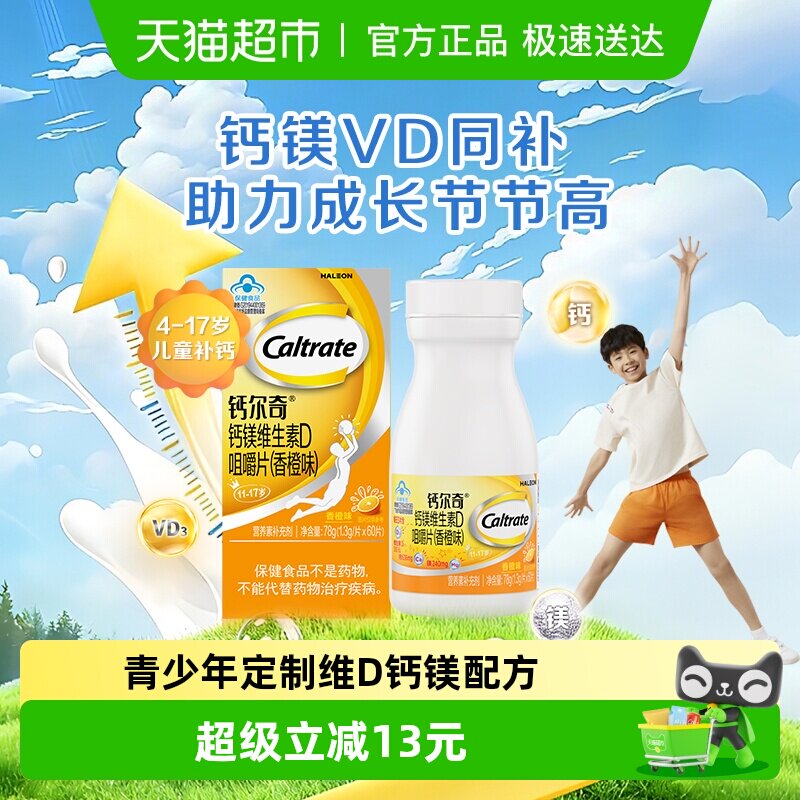 钙尔奇儿童钙片4岁以上宝宝青少年4-17岁碳酸钙D3橙子味咀嚼片