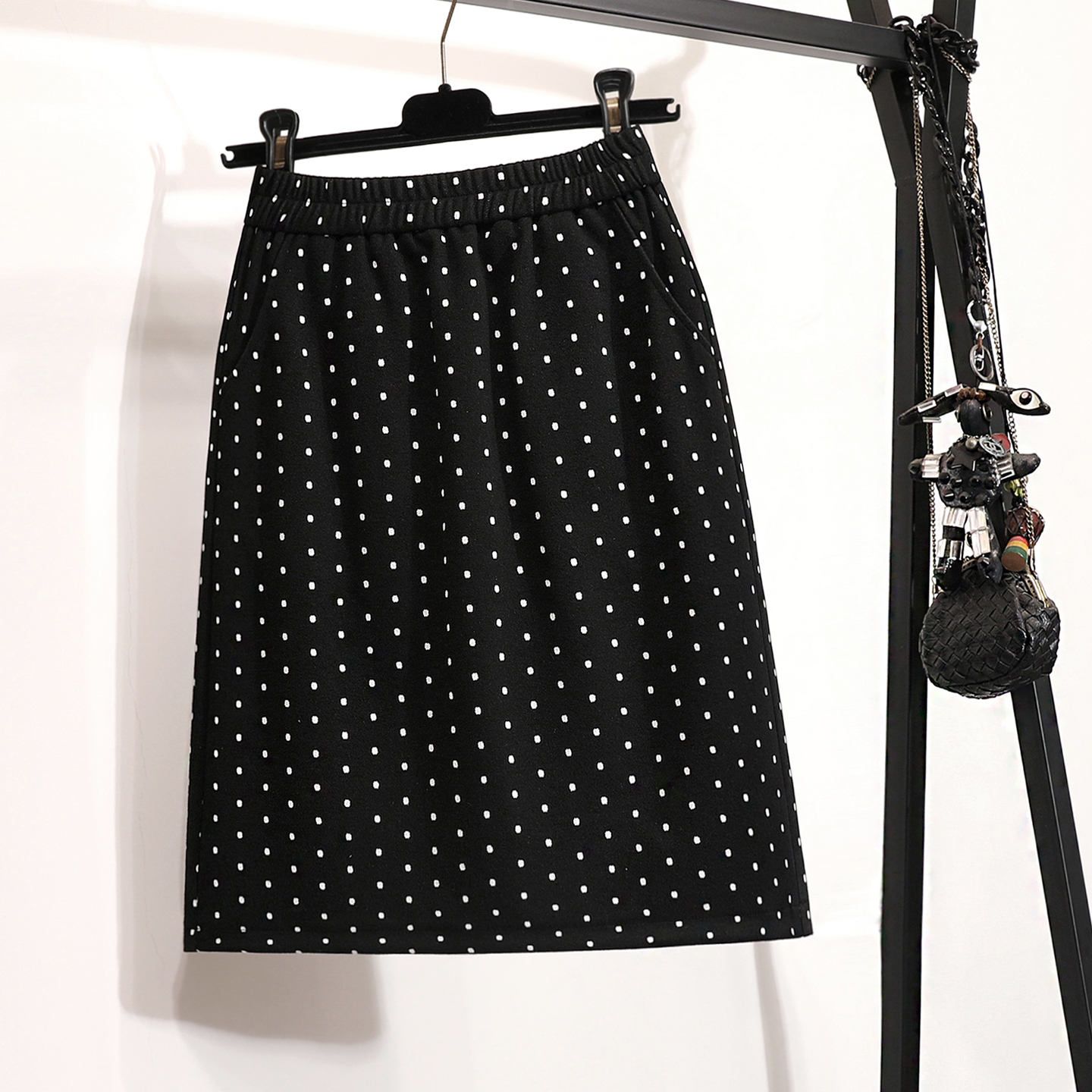 高腰波点毛呢裙松紧腰半身裙女冬小个子一步裙及膝中裙包裙直筒裙