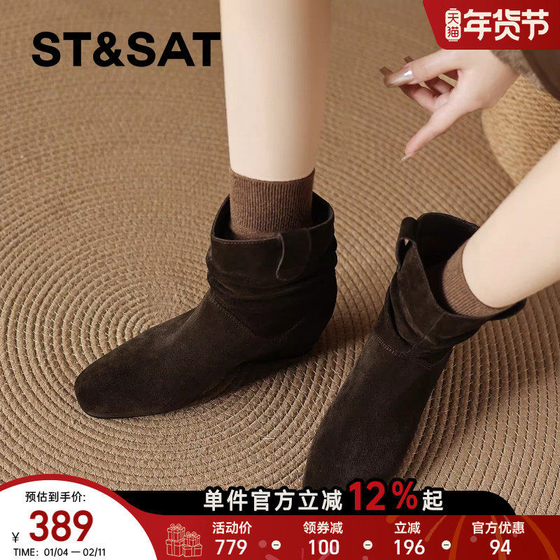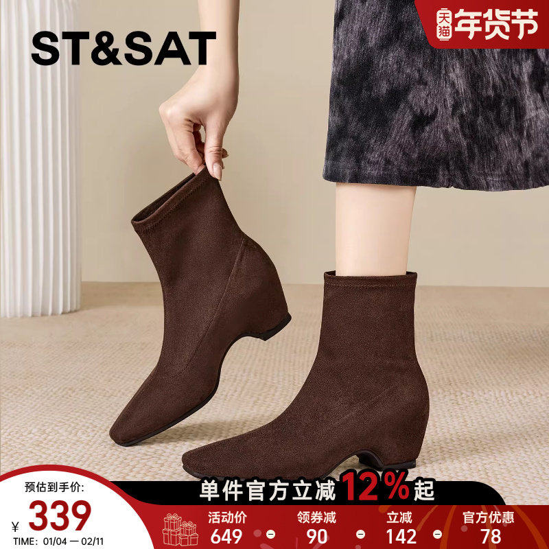 星期六复古棕色坡跟短靴女2025冬季新款方头绒面内增高时尚瘦瘦靴