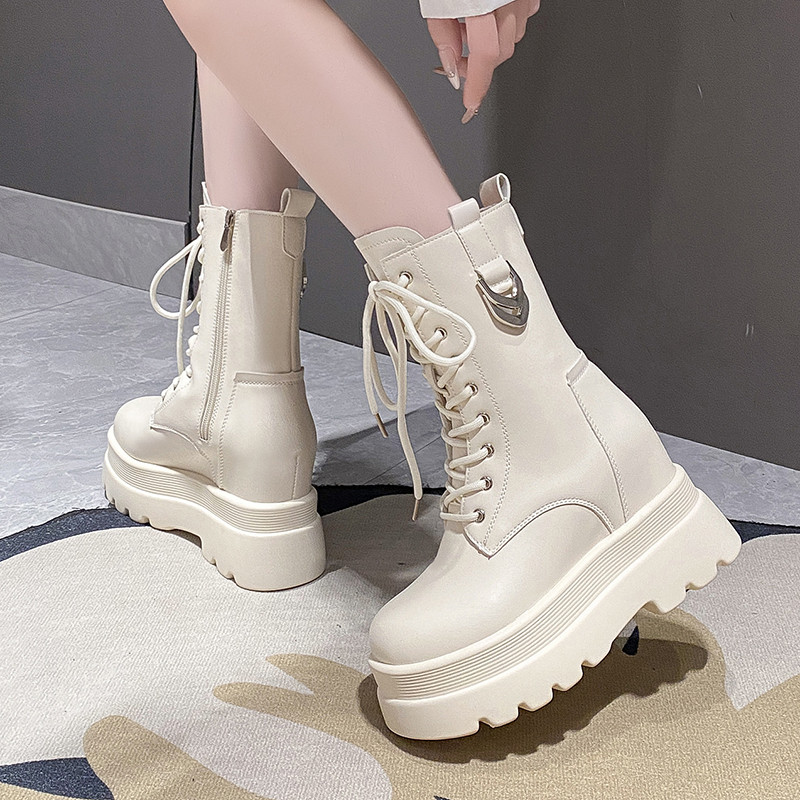 真皮高帮鞋女内增高马丁靴9cm小个子厚底坡跟白色短靴女春秋单靴