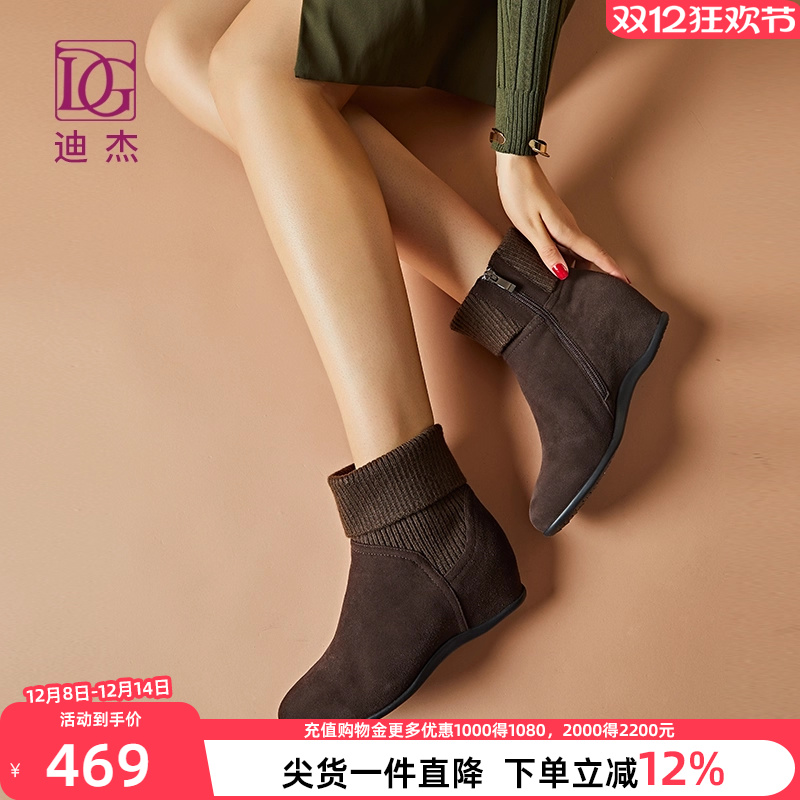 毛线内增高短靴女2025新款百搭坡跟磨砂皮中跟真皮平底裸靴及踝靴