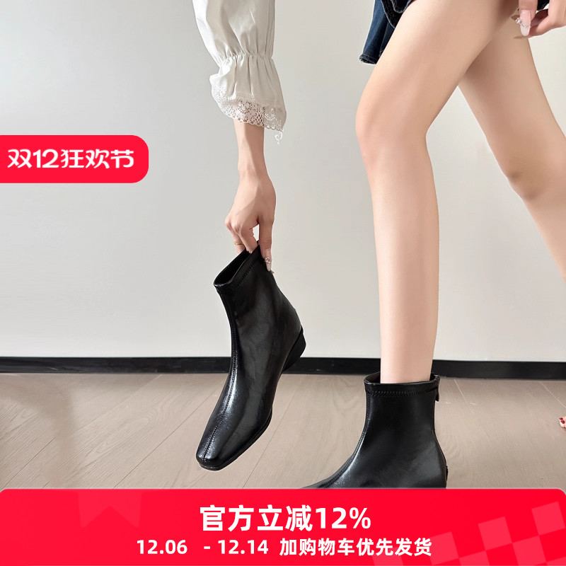 星期六加绒短靴女2025秋冬方头内增高裸靴美拉德弹力坡跟瘦瘦靴直
