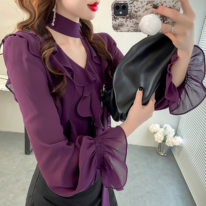 韩版系脖带雪纺女衬衫轻奢高级感衬衣显瘦V领荷叶边长袖秋装上衣