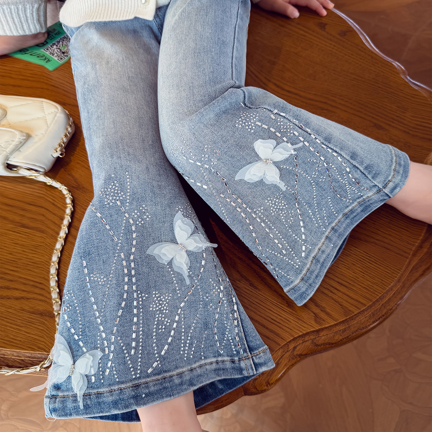 女童春装牛仔裤2026新款儿童韩版蝴蝶结珍珠花边喇叭裤小女孩裤子