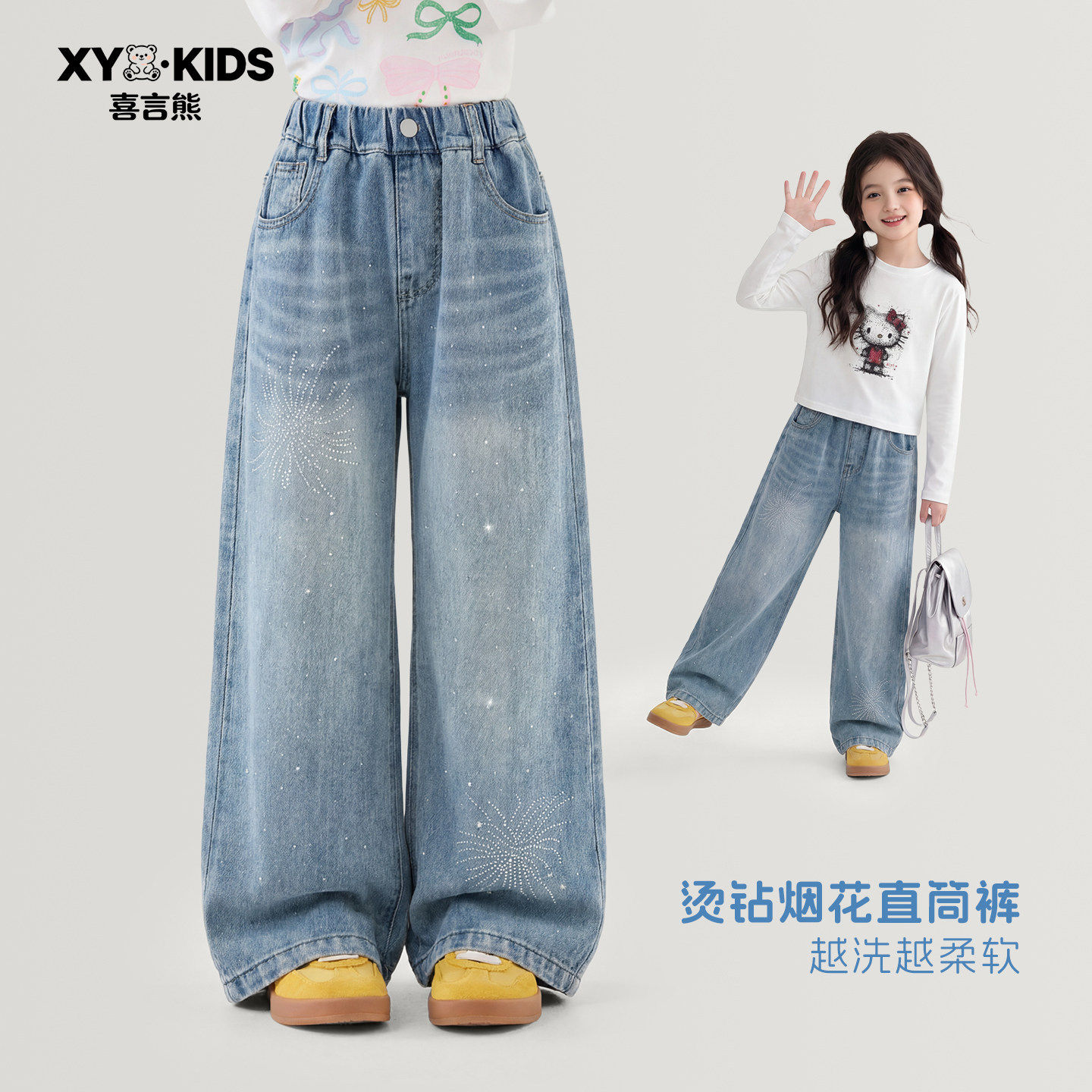 浅色带钻牛仔裤女童春季2026新款韩版直筒阔腿裤儿童女孩裤子春秋