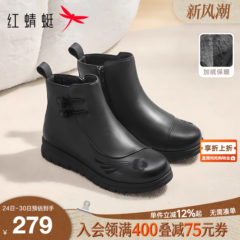 红蜻蜓官方妈妈鞋冬季皮鞋防滑鞋子女鞋保暖女靴中老年人真皮棉鞋