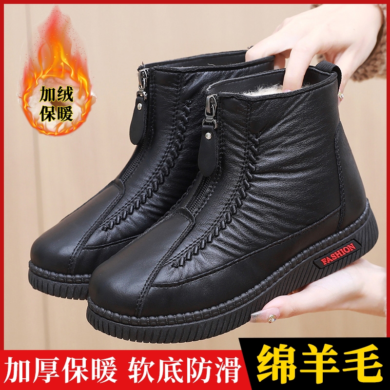 真皮妈妈鞋棉鞋冬季加绒保暖中年软底短靴防滑中老年人羊毛女靴子