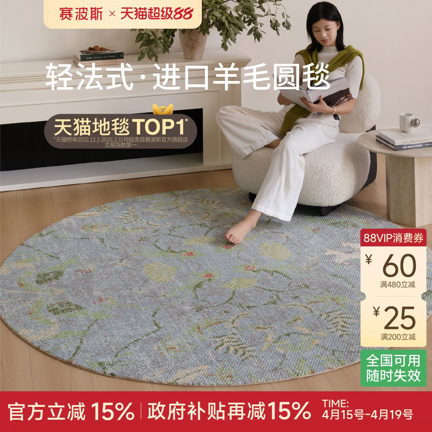 赛波斯人气同款! 法式轻奢圆形地毯无胶防水客厅卧室床边毯衣帽间