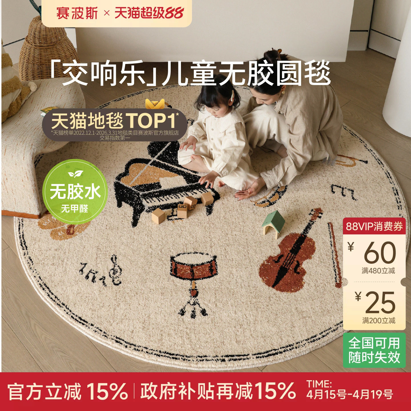 赛波斯「交响乐」无胶圆形地毯儿童房娱乐区防水抑菌琴房书房床边