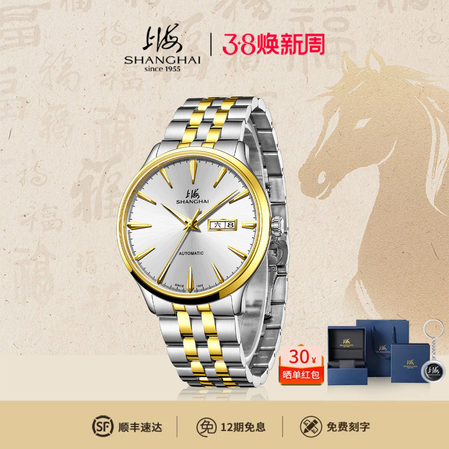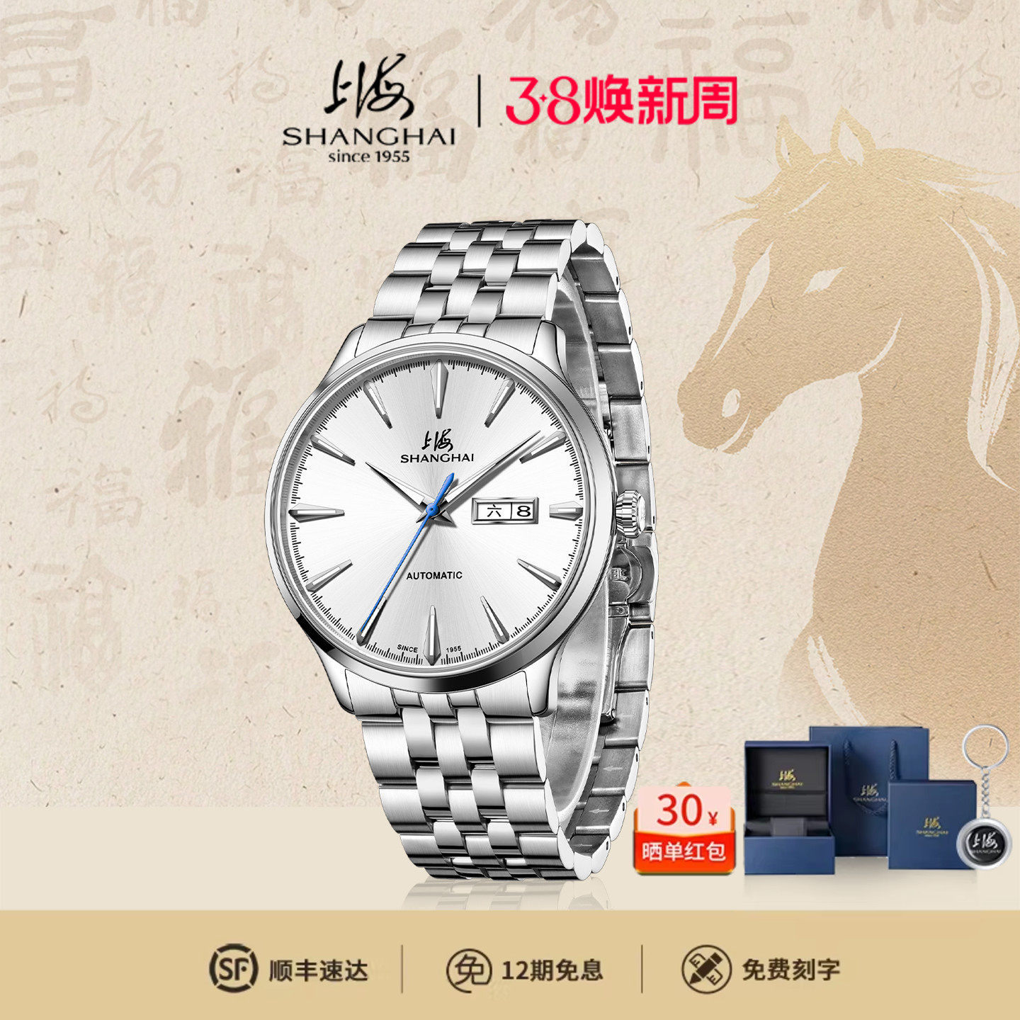上海牌2025新款男士全自动机械腕表夜光日历防水精钢表带商务送礼