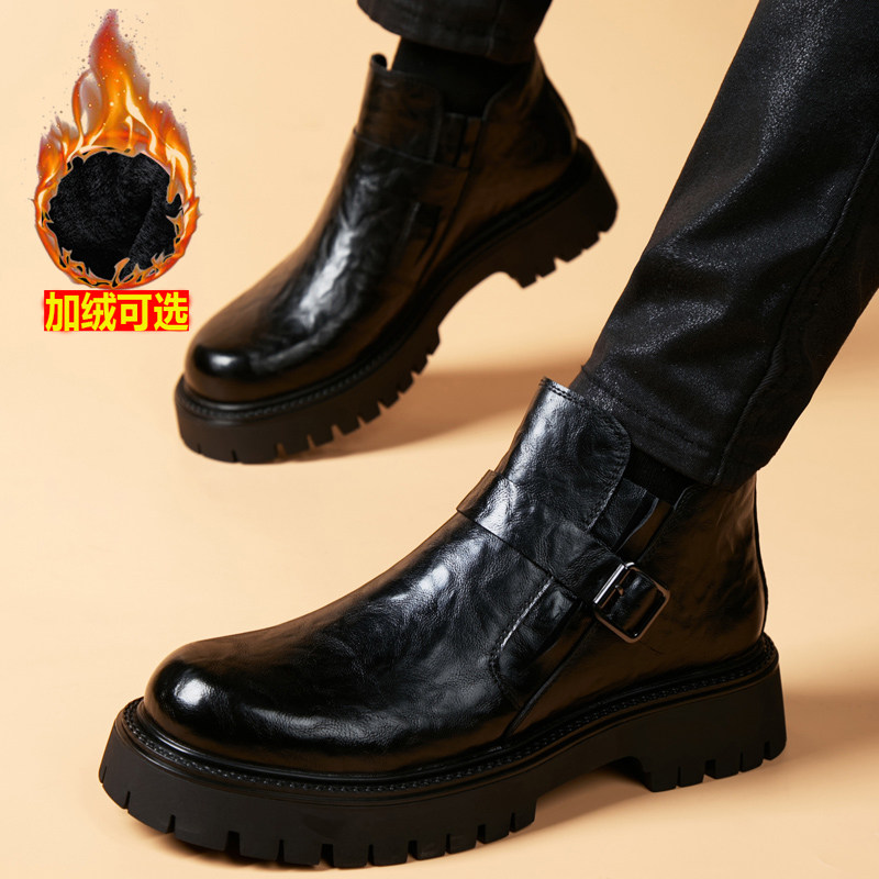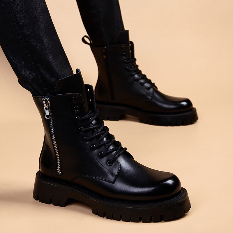 高帮厚底工装靴圆头真皮马丁靴男士加绒冬季新款潮流英伦风机车靴
