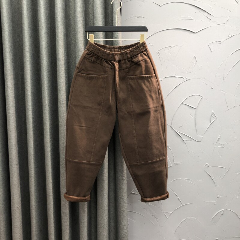 咖啡色加绒休闲哈伦牛仔裤女士秋季时尚宽松洋气加厚九分萝卜垮裤