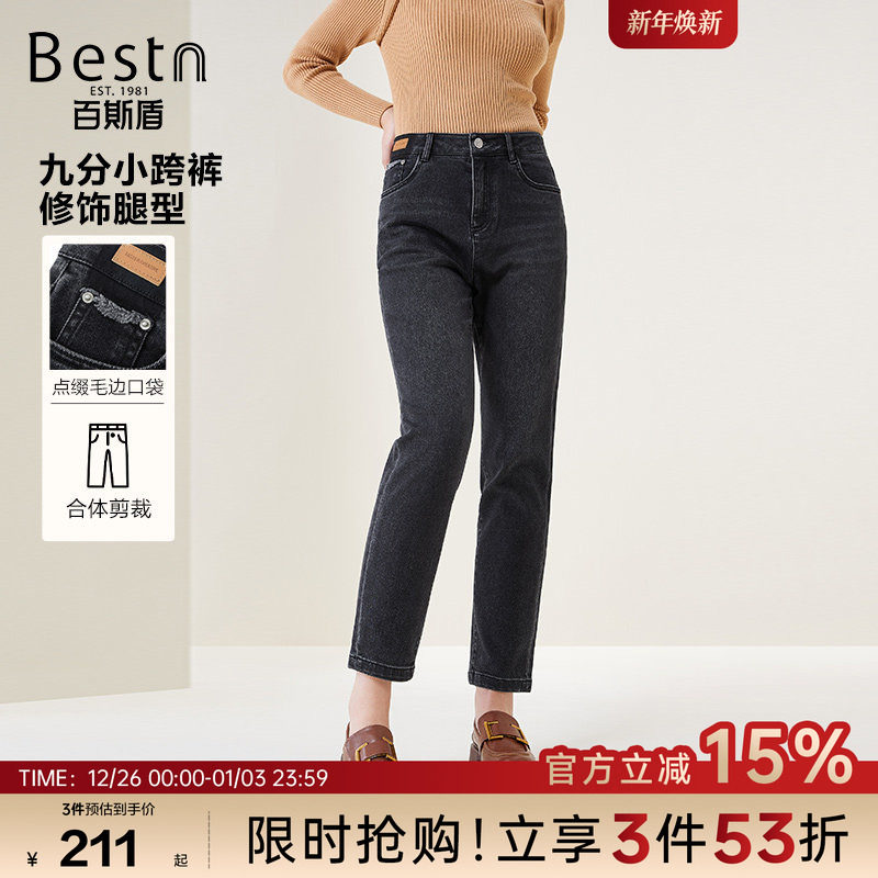 【雪貂绒】百斯盾官方女装牛仔裤冬季新款保暖舒适修身九分小垮裤