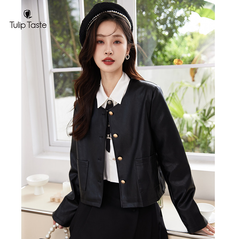 郁香菲短款皮衣女时尚通勤春秋百搭修身小个子圆领单排扣pu外套