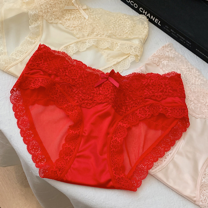 瑶瑶闺蜜法式浪漫蕾丝花边高级缎面本命年内裤女性感红色交叉低腰