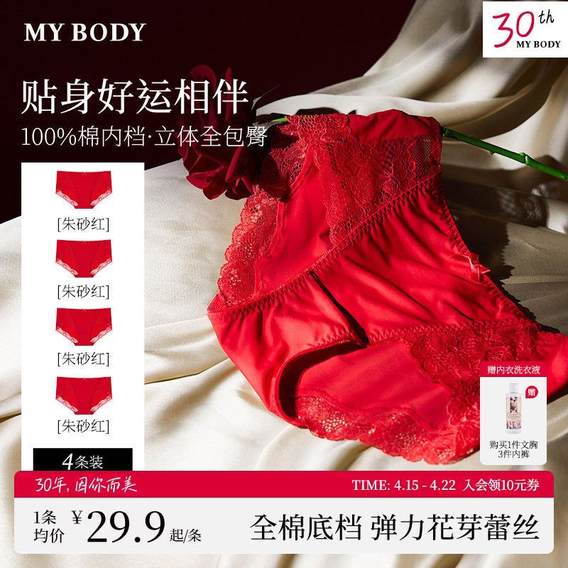 4条装MYBODY商场同款红品内裤女抗菌纯棉底裆性感蕾丝中腰三角裤