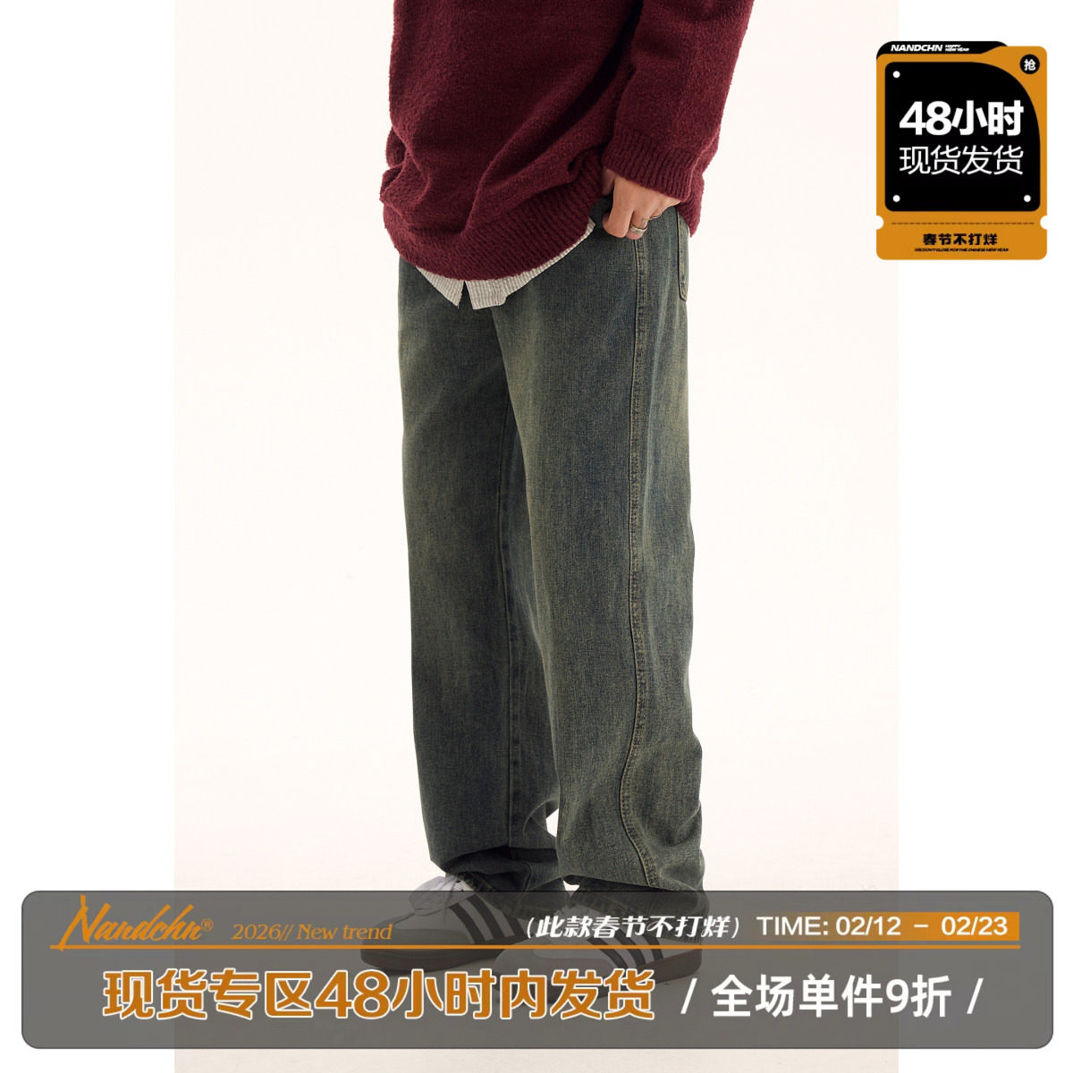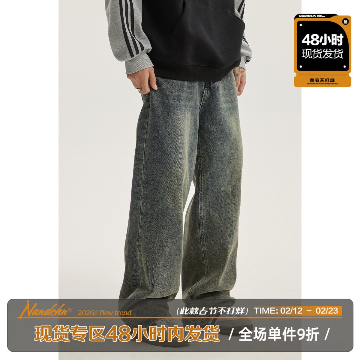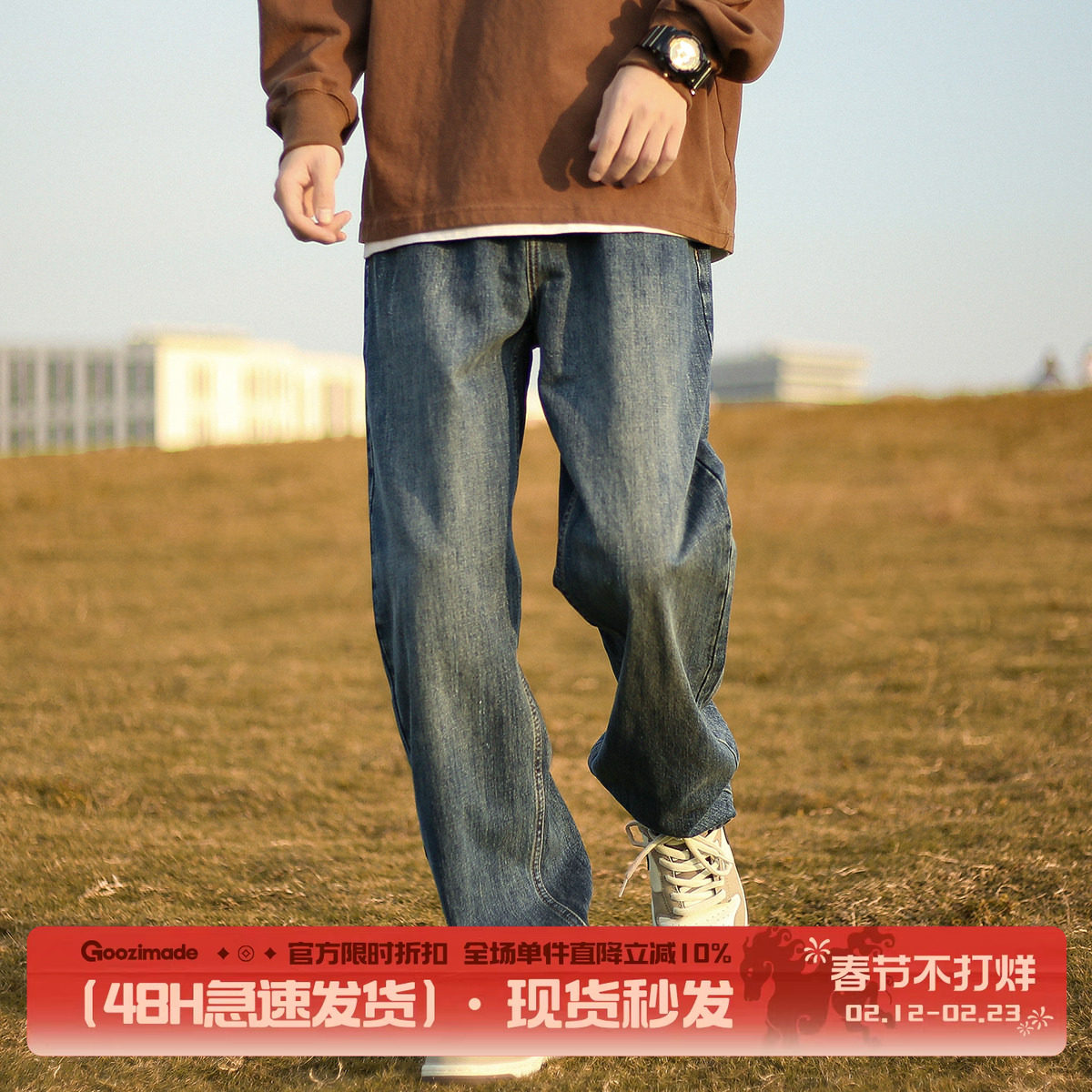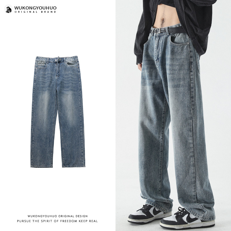 悟空有货美式复古基础做旧直筒牛仔裤男街头宽松潮流百搭阔腿长裤