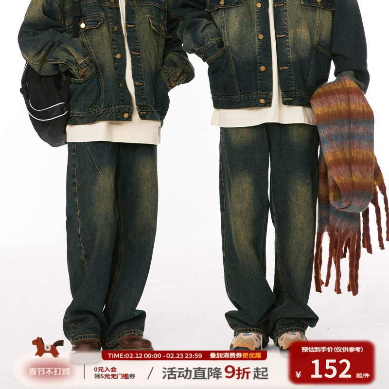 男道美式复古水洗做旧直筒牛仔裤男女秋季ins潮宽松阔腿休闲长裤