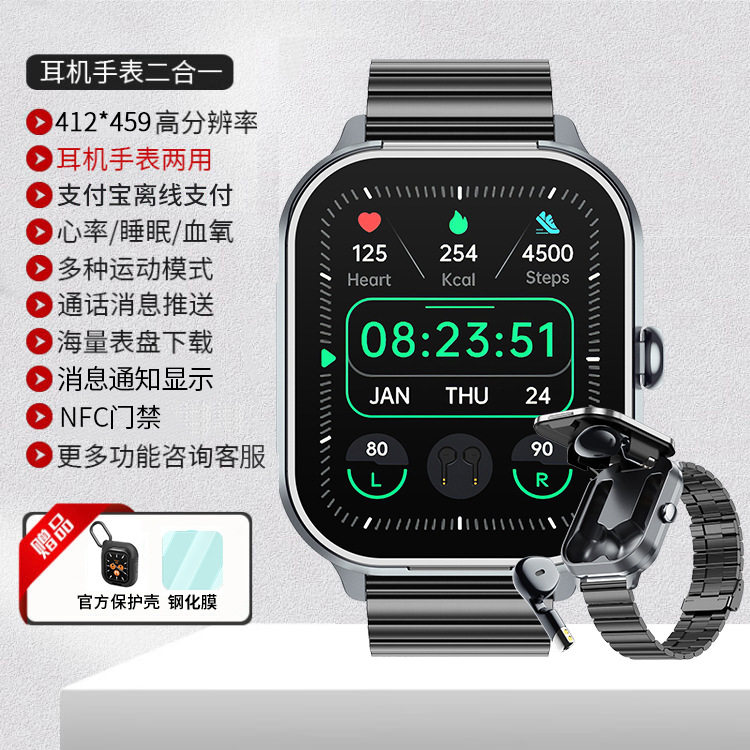 彬格智能手表耳机三合一多功能蓝牙通话听歌运动手环适用安卓iOS