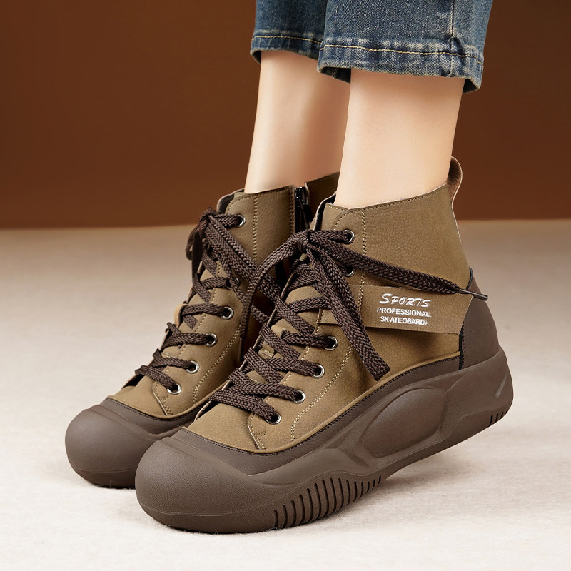 嘉俪多女鞋韩版休闲鞋牛反皮柔软系带厚底圆头深口2025春季新款