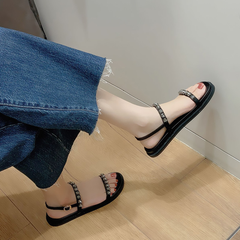 平底水钻凉鞋女气质露趾夏季平跟仙女风罗马一字扣大码女鞋41-43