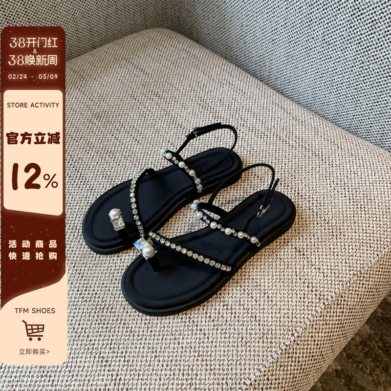 【TFM】水钻珍珠套趾平底凉鞋女2026夏季新款仙女气质百搭罗马鞋