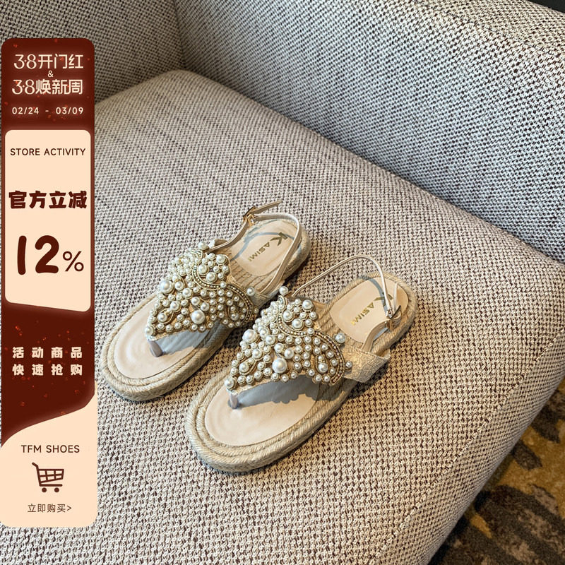 【TFM】2025年夏季新款平底凉鞋女水钻珍珠编织罗马风夹趾沙滩鞋