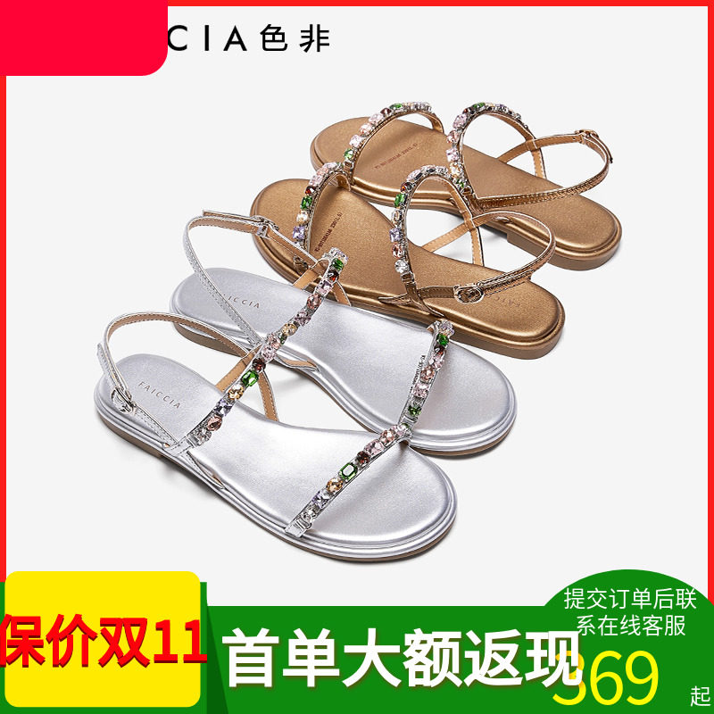 红蜻蜓凉鞋女夏季新款女鞋法式银色平底鞋子绝美水钻罗马凉鞋女款