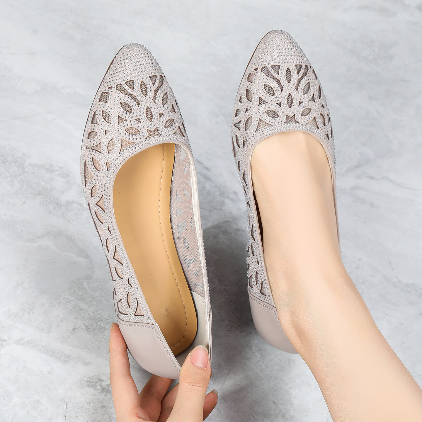 尖头网纱透气平底单鞋女春浅口满天星水钻镂空凉鞋大码女鞋41到43