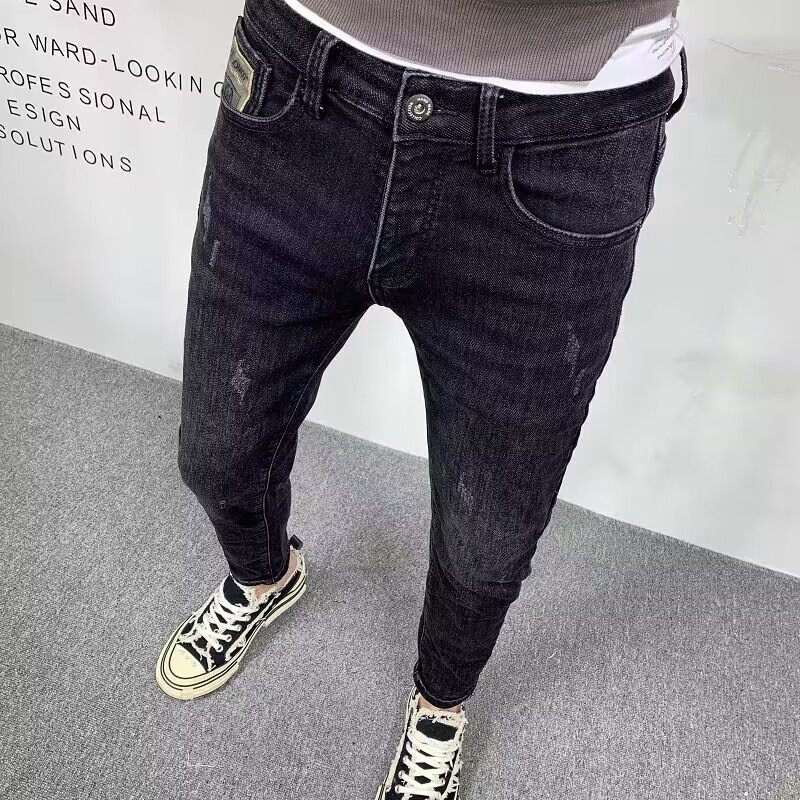 简单版毛边九分牛仔裤男春夏韩版休闲潮流黑色修身弹力百搭小脚裤