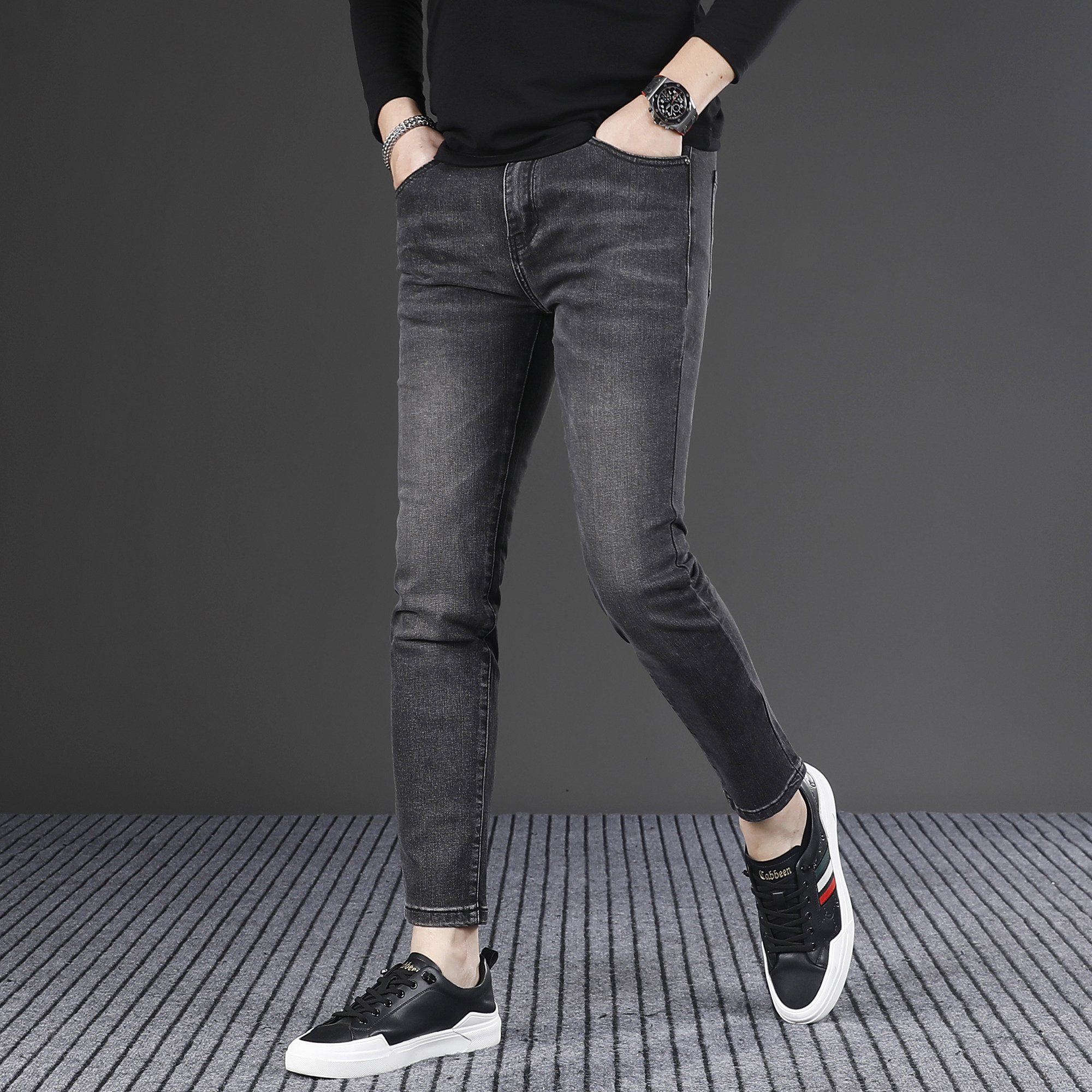 高端黑色九分牛仔裤男款韩版修身小脚秋冬潮牌弹力9分休闲裤子男