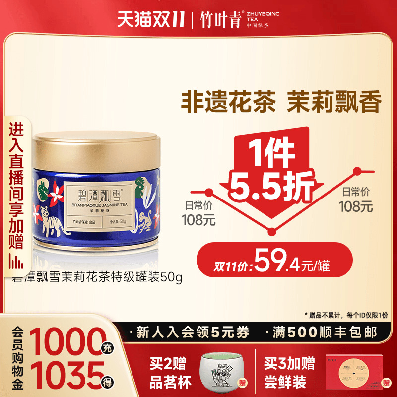 碧潭飘雪茉莉花茶特级茶叶广西横州茉莉小蓝罐50g自己喝竹叶青