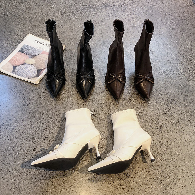 后拉链性感尖头加绒高跟短靴女秋冬新款甜美蝴蝶结细跟显瘦时装靴