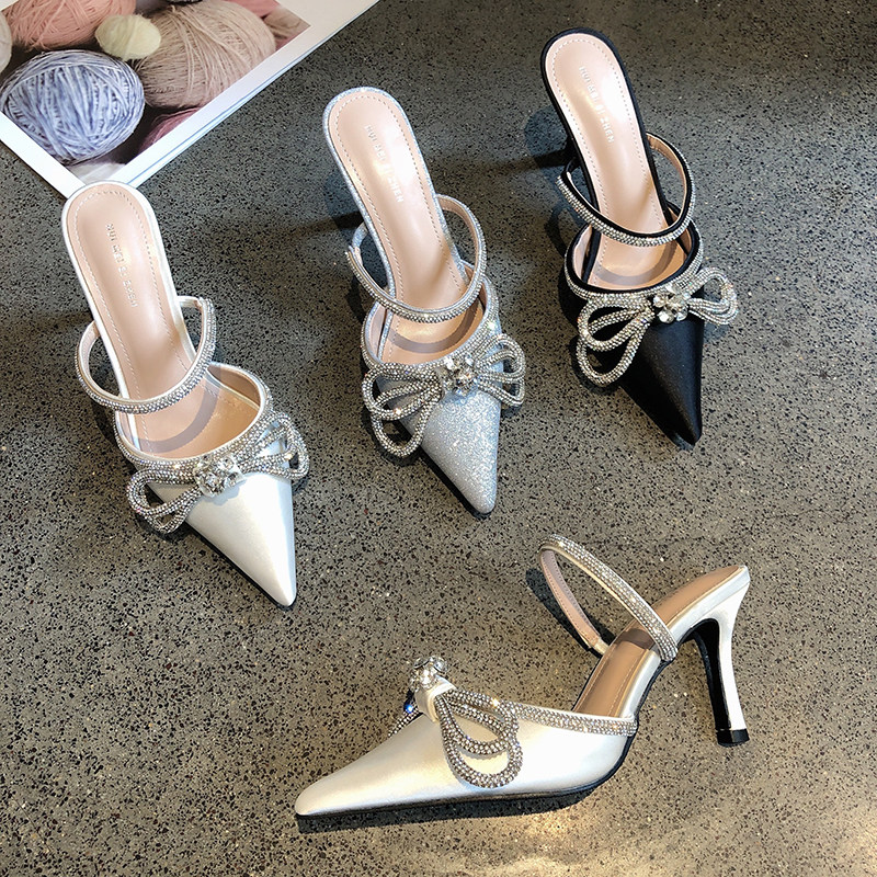 2025年新款包头水钻蝴蝶结细跟半拖凉鞋女尖头气质名媛性感高跟鞋