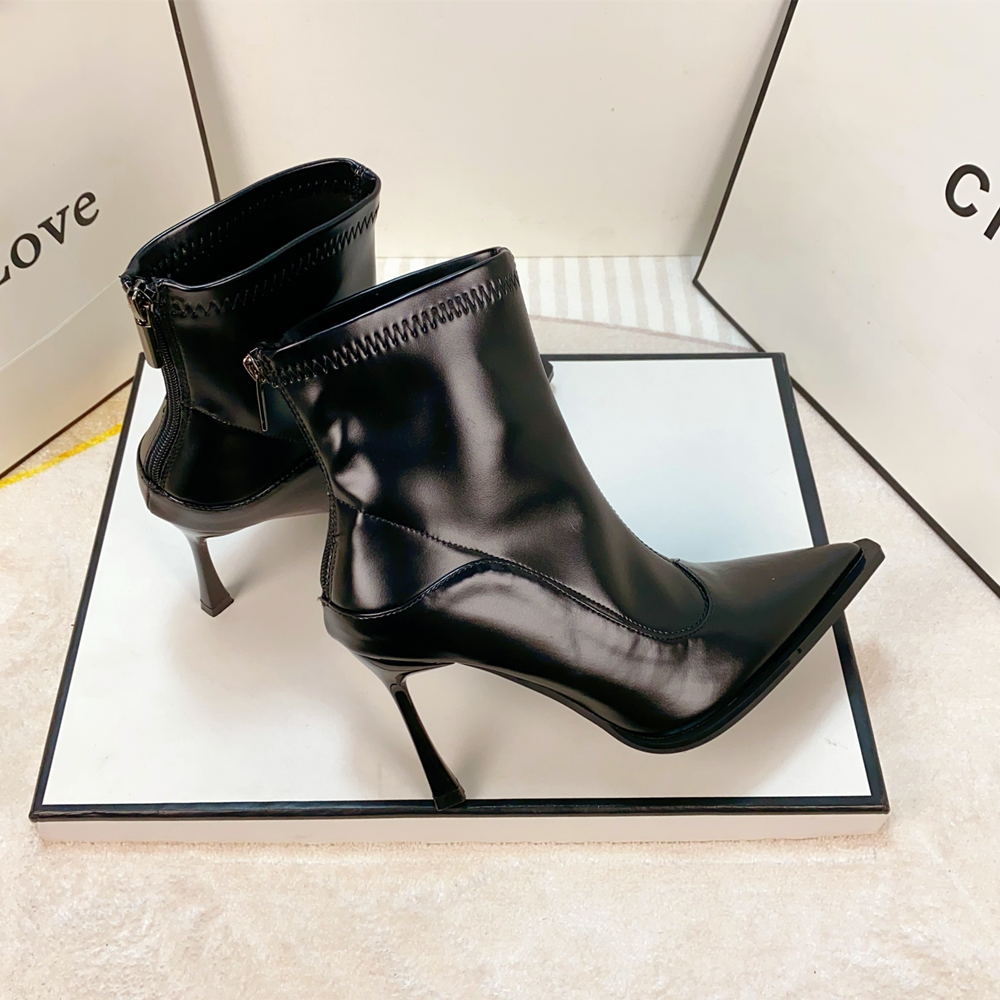 欧美2025秋季新款黑色显瘦尖头高跟短靴女细跟性感弹力靴瘦瘦靴女