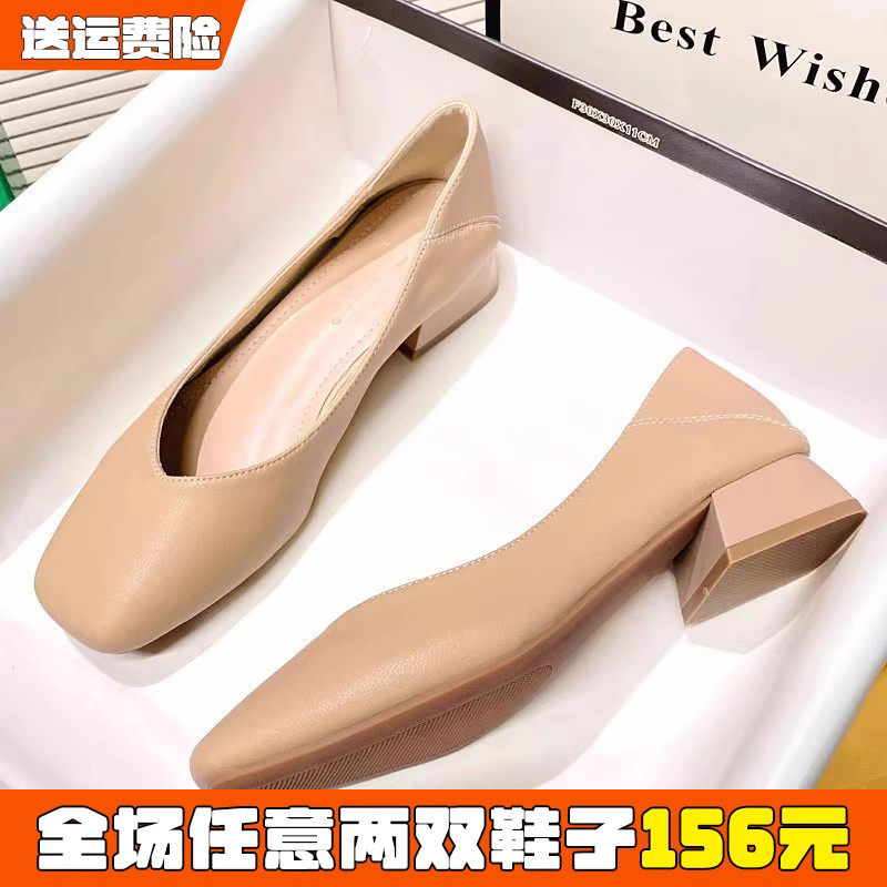 羊皮裸色粗跟尖头中跟5cm高跟鞋女7厘米2025春秋款软皮配裙子单鞋
