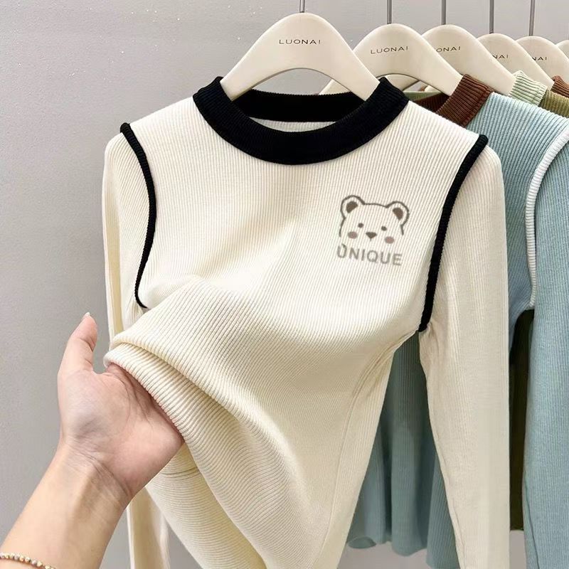 女童新款打底衫圆领长袖春秋洋气中大童女孩拼接宽松百搭洋气上衣