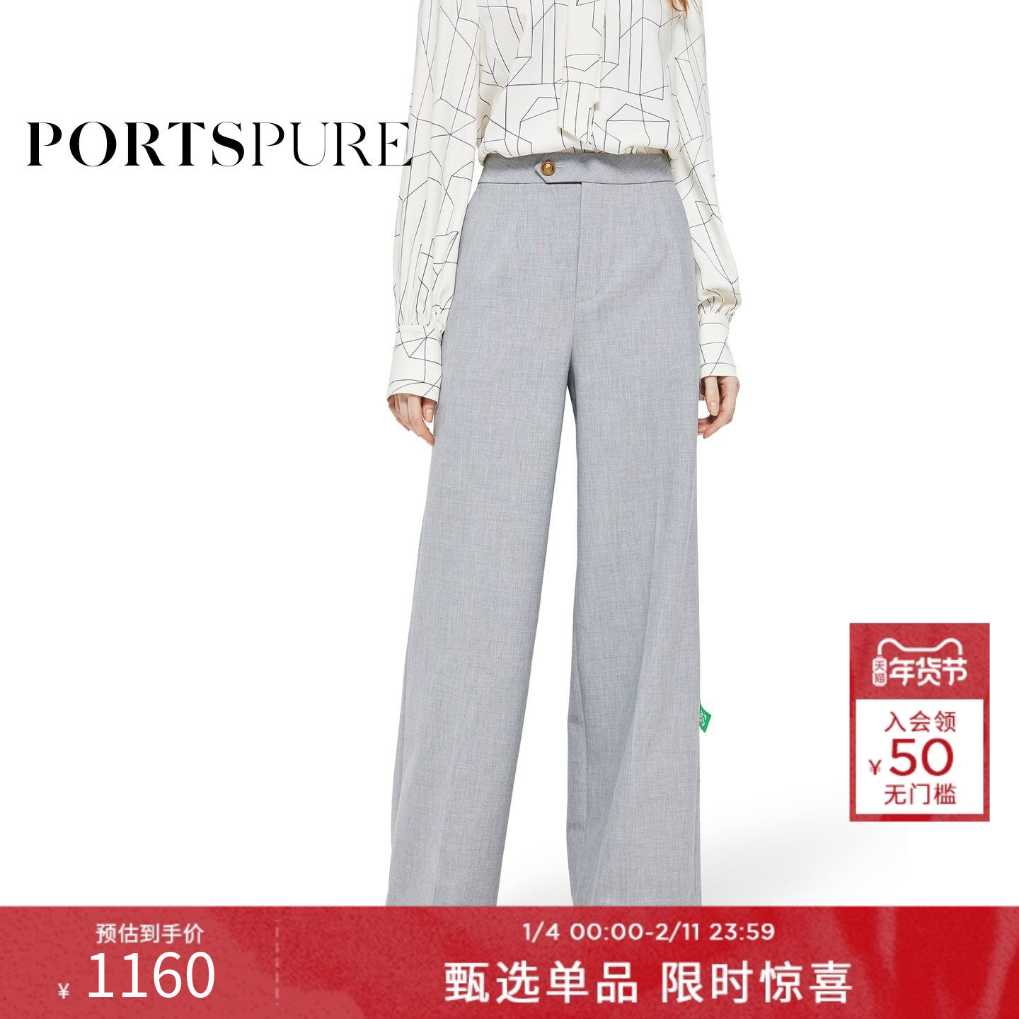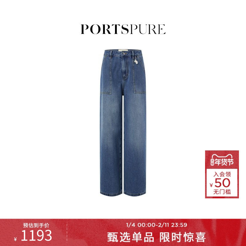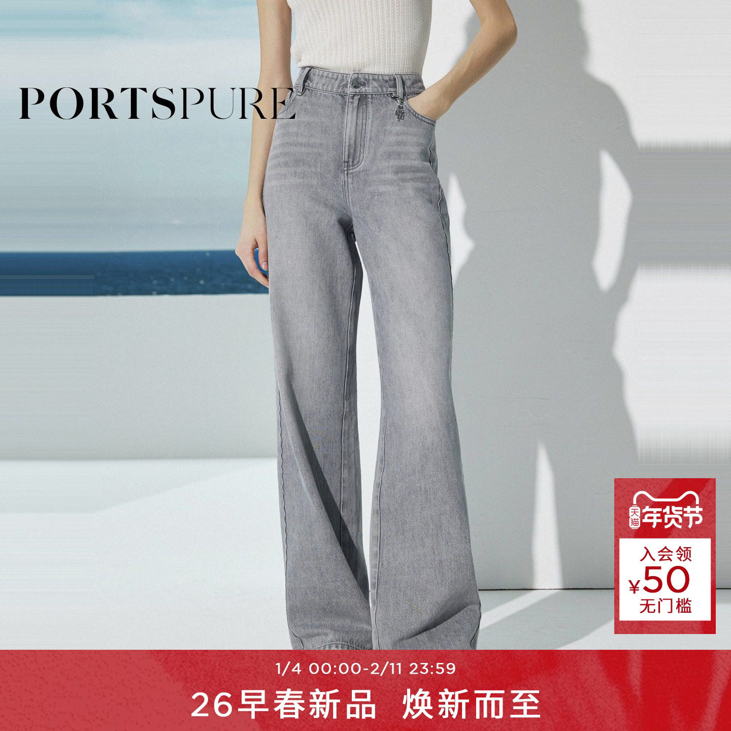 宝姿PORTSPURE女装2026早春新品金属logo牌波浪侧缝直筒灰牛仔裤