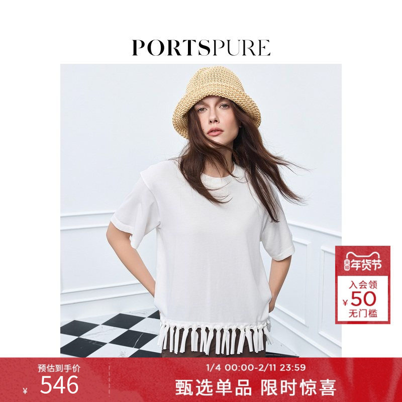 宝姿PORTSPURE女装舒适百搭手工编织流苏下摆T恤短袖上衣