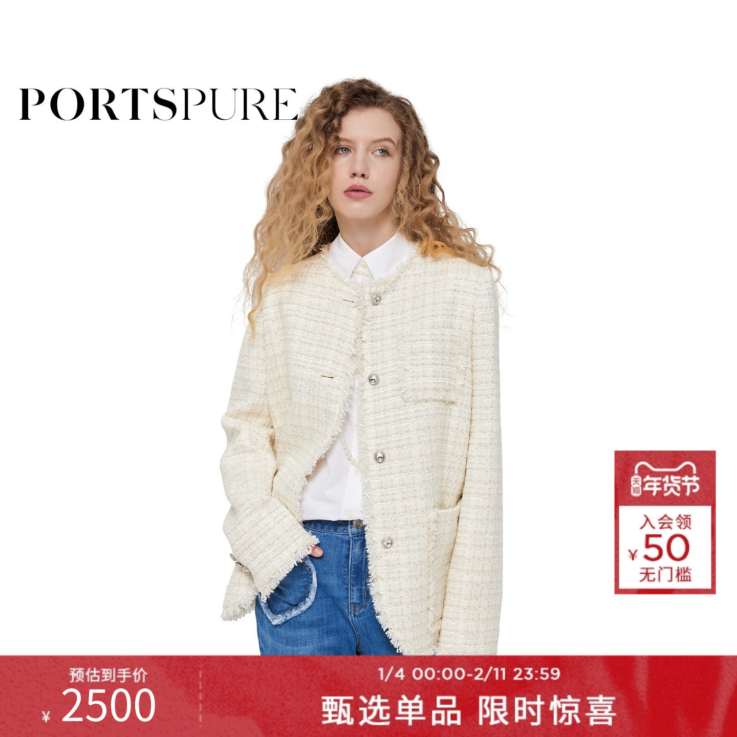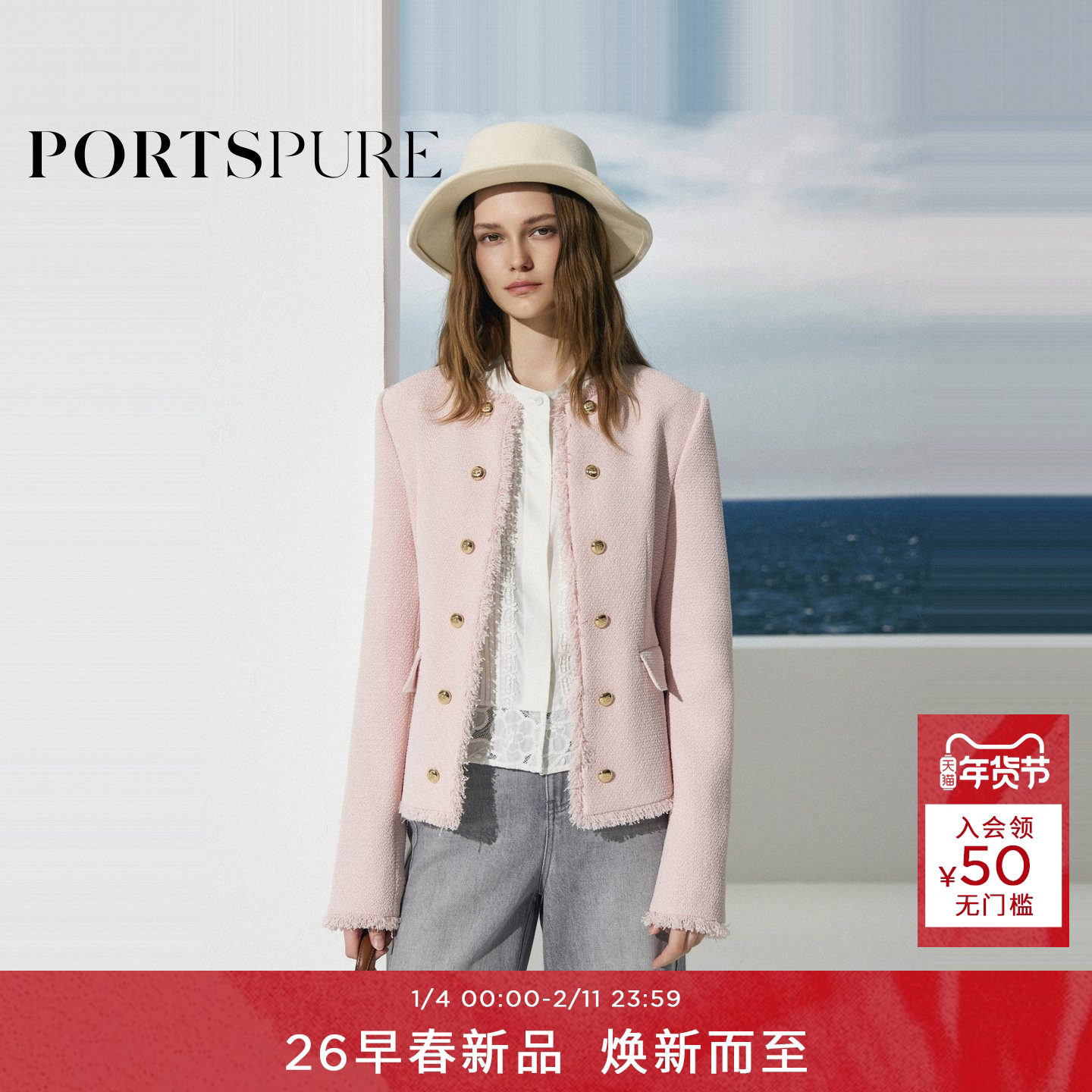 宝姿PORTSPURE女装2026早春新品饰金扣毛边修身香风短外套