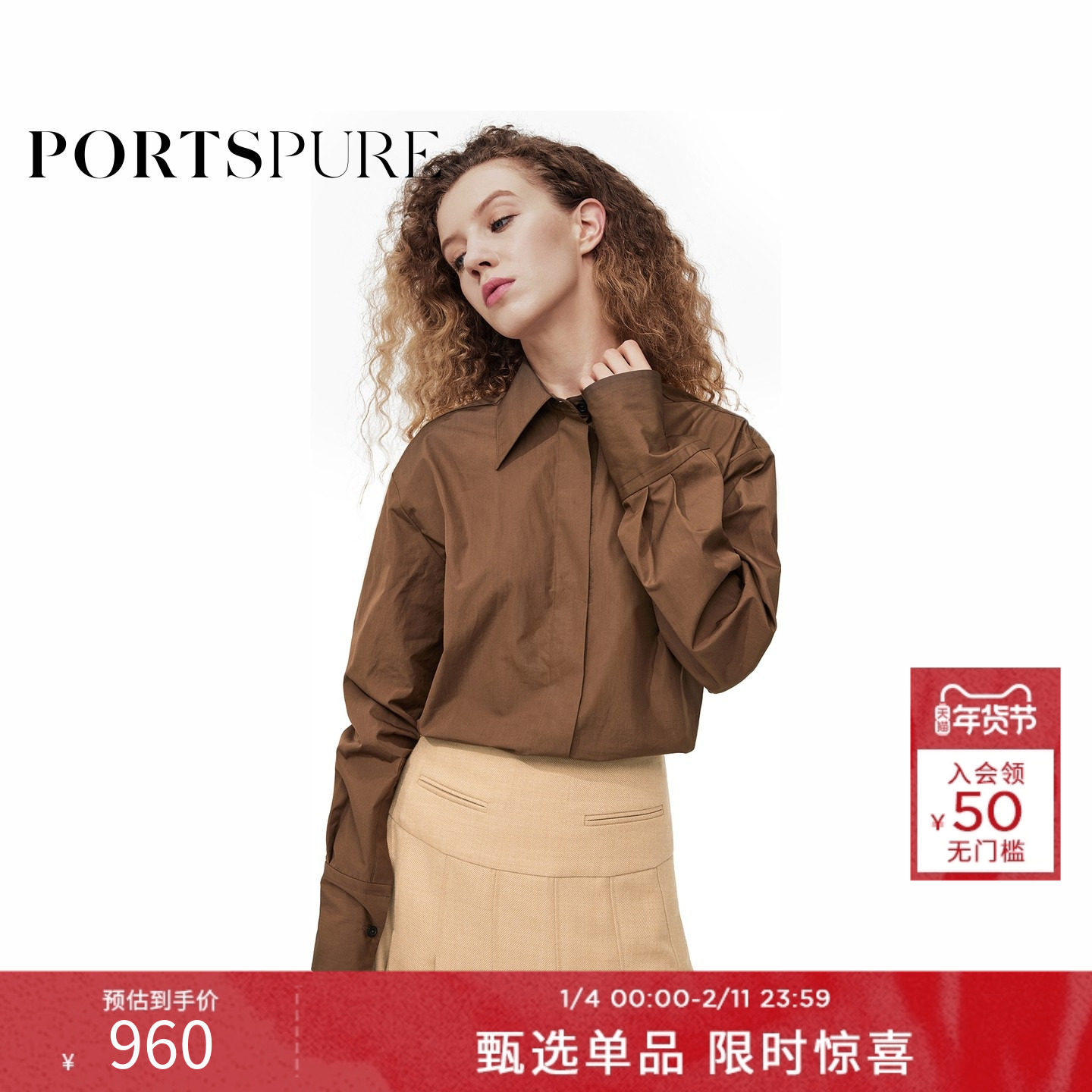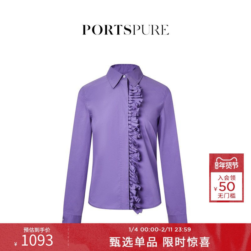 宝姿PORTSPURE女装舒适淡人气质手工编织门襟设计感衬衫