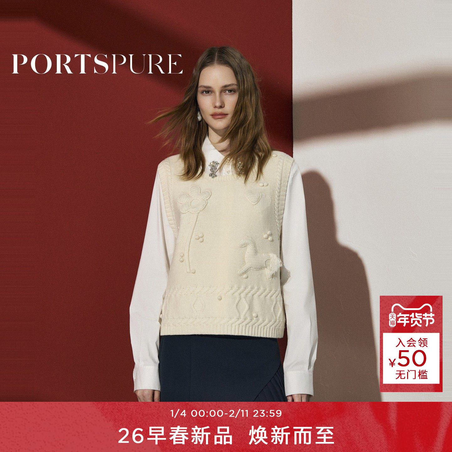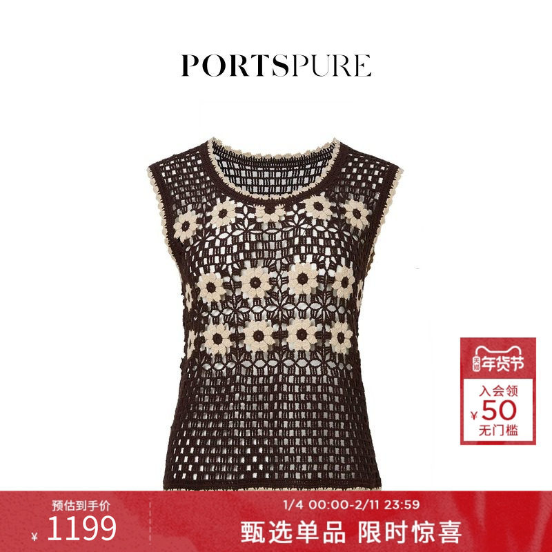 宝姿PORTSPURE女装2026早春新品花卉立体勾针绣圆领针织马甲