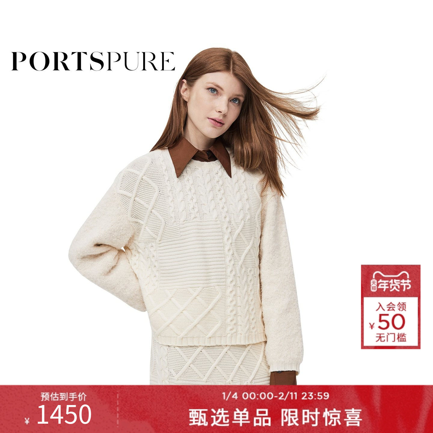 【宋轶同款】宝姿PORTSPURE女装冬季温柔慵懒绞花针织衫