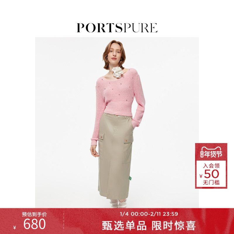宝姿PORTSPURE女装针织钻饰收腰长袖v领套头针织衫RT3K166SKD007