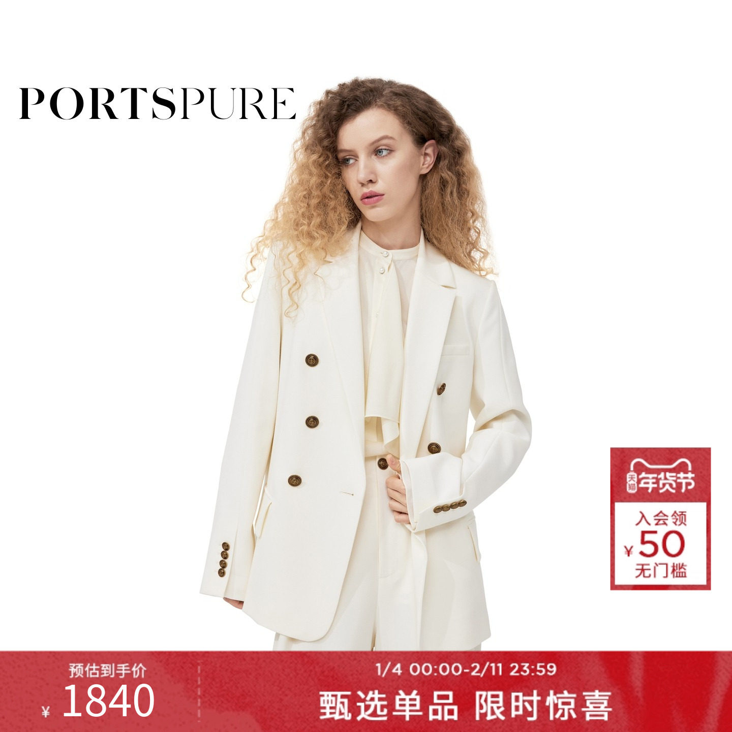 宝姿PORTSPURE女装春秋绵羊毛经典休闲金属双排扣高级感西装外套