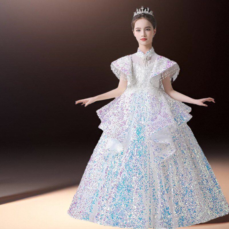女大童白色晚礼服高端洋气亮片公主裙儿童主持走秀长款演出服秋冬