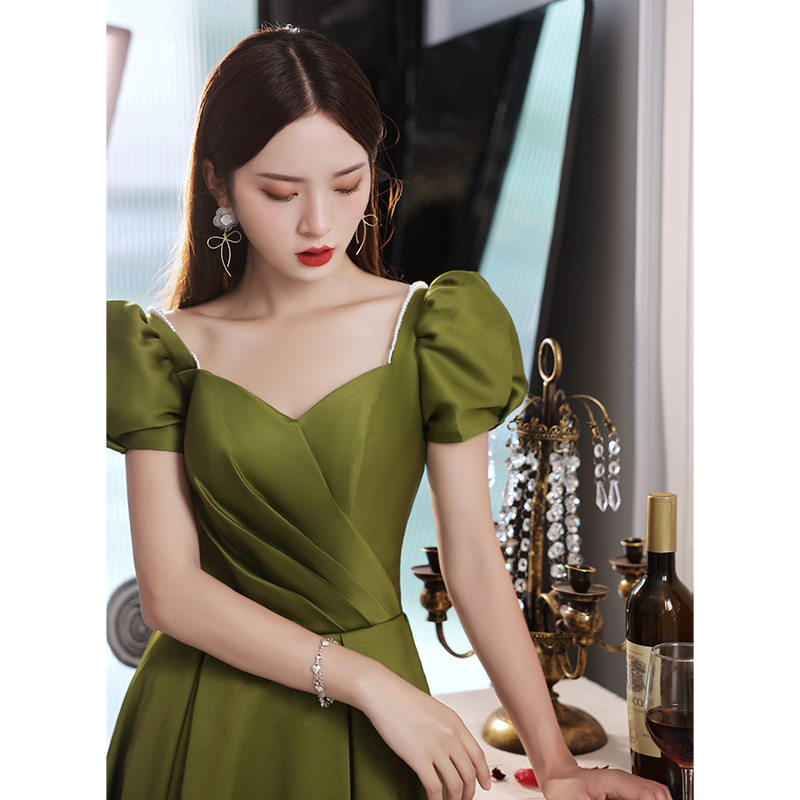 法式晚礼服2026新款绿色泡泡袖修身长款礼服缎面显气质晚礼服秋冬