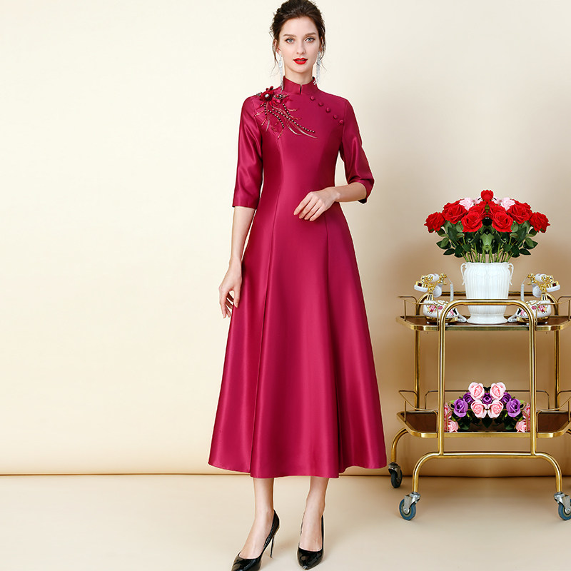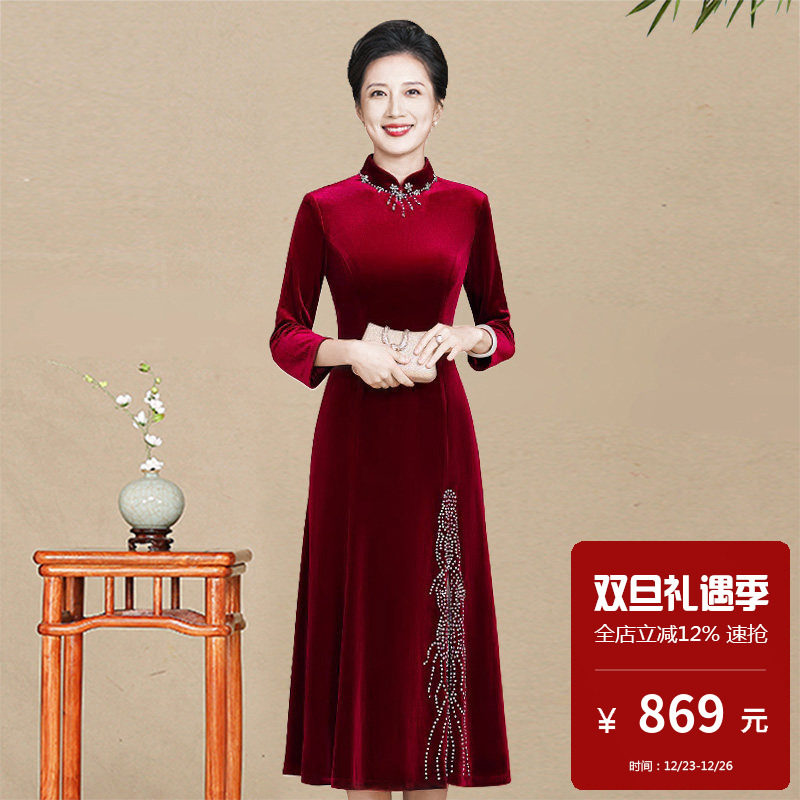 金丝绒旗袍式连衣裙中长款长袖婚礼宴会喜婆婆妈妈晚礼服改良秋冬