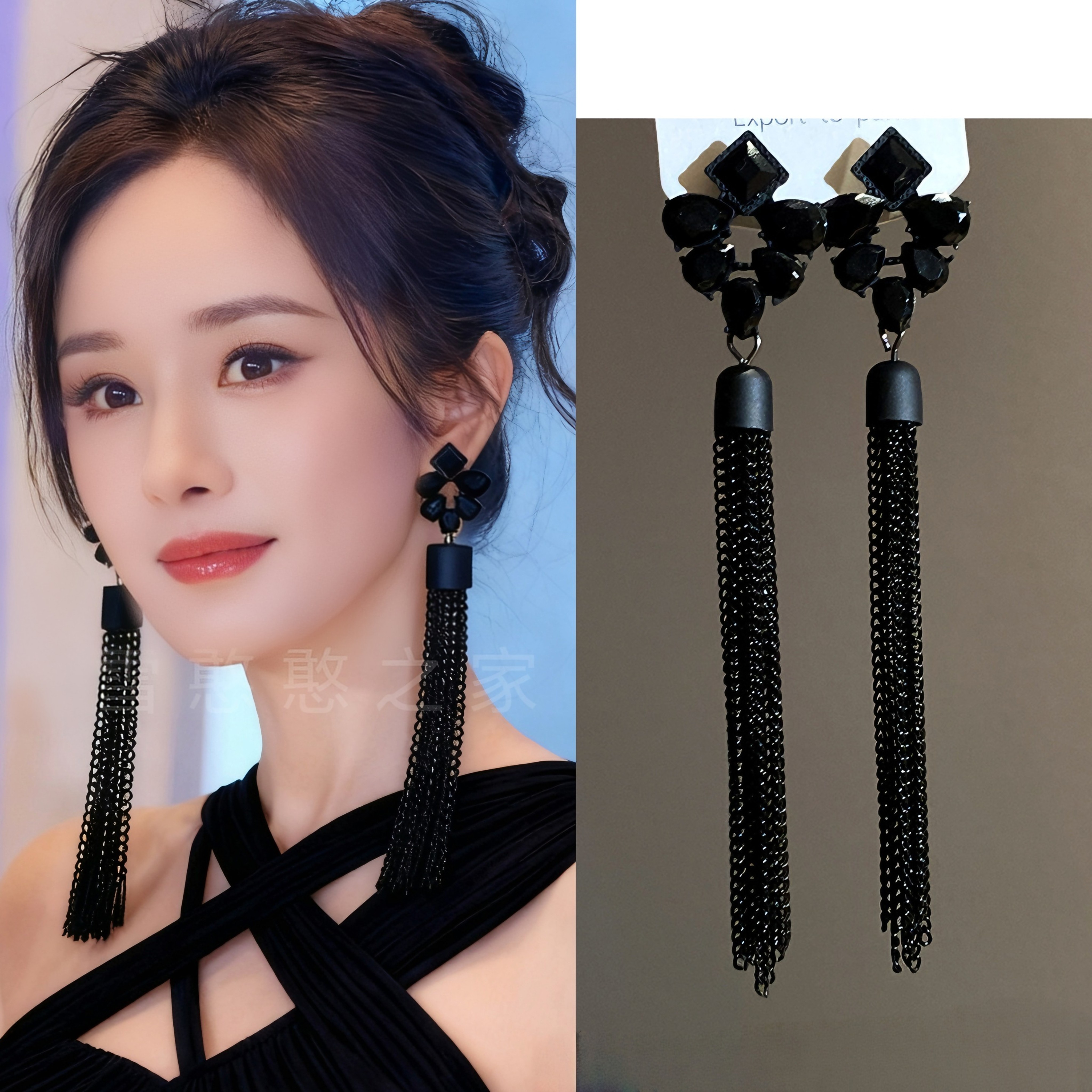黑色长款流苏耳环耳夹耳钉耳坠2025秋冬新款女晚礼服耳饰旅游度假
