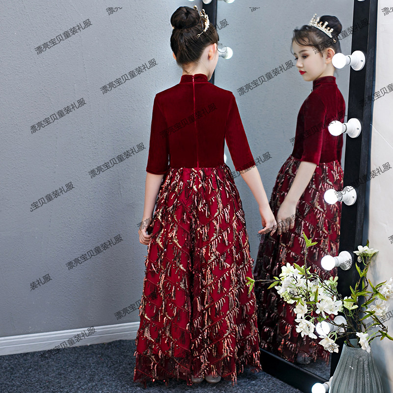 高档女童晚礼服中大童主持礼服秋冬新款儿童公主裙长款钢琴演出服